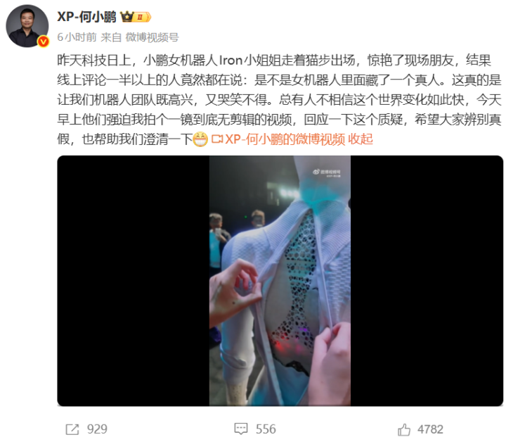 反转来得很快,在次日11点左右,何小鹏发布了一条视频,一镜到底地将IRON机器人的背部、小臂“皮肤”扒开,展示内部的机械结构,再做了两次走路的展示。